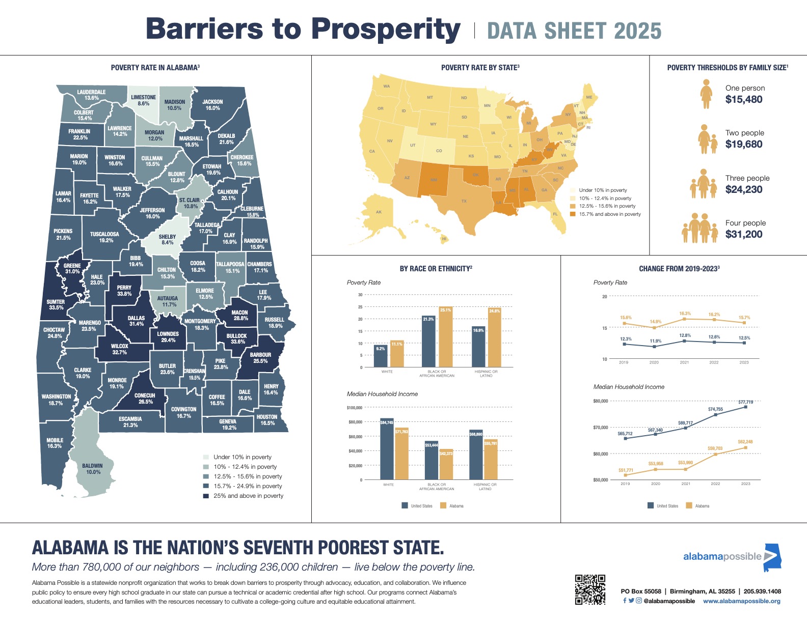 On an annual basis, we compile and publish data through the Barriers to Prosperity Data Sheet, which highlights rates of poverty, food security, educational attainment, employment, and health insurance coverage for all 67 Alabama counties. We draw from sources including the U.S. Census Bureau, U.S. Bureau of Labor Statistics, Alabama Commission on Higher Education, and Alabama Department of Human Resources to generate a comprehensive resource. In addition to our data sheet, we offer an interactive online resource that allows you to examine or compare data by county. These resources are complemented by two discussion guides, one for secondary and postsecondary education settings and another for any community setting. We host webinars each year introducing the most current data and highlighting some key findings. In addition, we have a Breaking Barriers to Prosperity Toolkit that consists of three community-engaging components. Using the toolkit, communities give context to the numbers provided in the Data Sheet by offering insight into the challenges they face before working together to take action at the local level.
