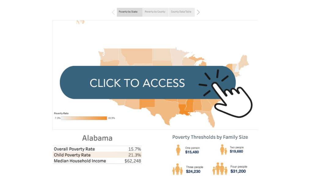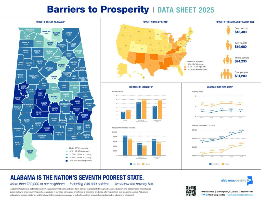 On an annual basis, we compile and publish data through the Barriers to Prosperity Data Sheet, which highlights rates of poverty, food security, educational attainment, employment, and health insurance coverage for all 67 Alabama counties. We draw from sources including the U.S. Census Bureau, U.S. Bureau of Labor Statistics, Alabama Commission on Higher Education, and Alabama Department of Human Resources to generate a comprehensive resource. In addition to our data sheet, we offer an interactive online resource that allows you to examine or compare data by county. These resources are complemented by two discussion guides, one for secondary and postsecondary education settings and another for any community setting. We host webinars each year introducing the most current data and highlighting some key findings. In addition, we have a Breaking Barriers to Prosperity Toolkit that consists of three community-engaging components. Using the toolkit, communities give context to the numbers provided in the Data Sheet by offering insight into the challenges they face before working together to take action at the local level.